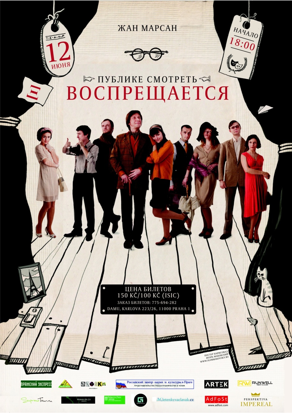 Разрешите от имени наших партнеров пригласить Вас на премьеру Пражского театра Студия Кси нового спектакля «Публике смотреть воспрещается», по пьесе Жана Марсана. Это удивительно интригующие представление, рассказывающее зрителю о закулисной жизни театра. О любовных историях, шантаже, интригах и просто о быте в нем. Вы окунетесь в атмосферу Франции, Парижа середины прошлого века.