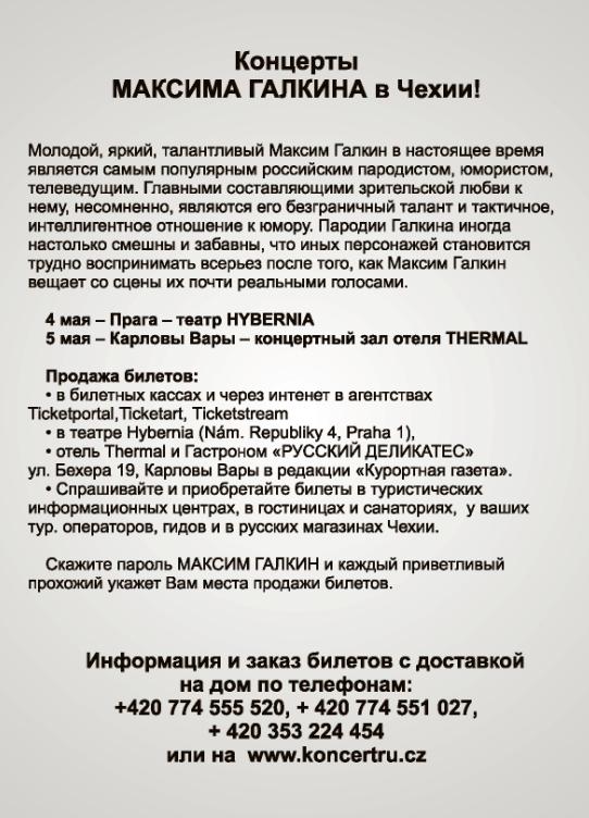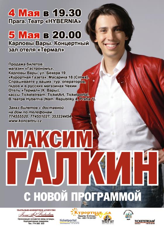 Share Facebook Twitter LinkedIn Pinterest Email Холдинг PERSPEKTIVA IMPEREAL s.r.o. является партнером мероприятия Феерическое шоу Максима Галкина в Чехии 4 мая Театр HYBERNIA Прага 19:30 5 мая большой концертный зал отеля Термал Карловы Вары 20:00 Новая программа,новые пародии,шутки