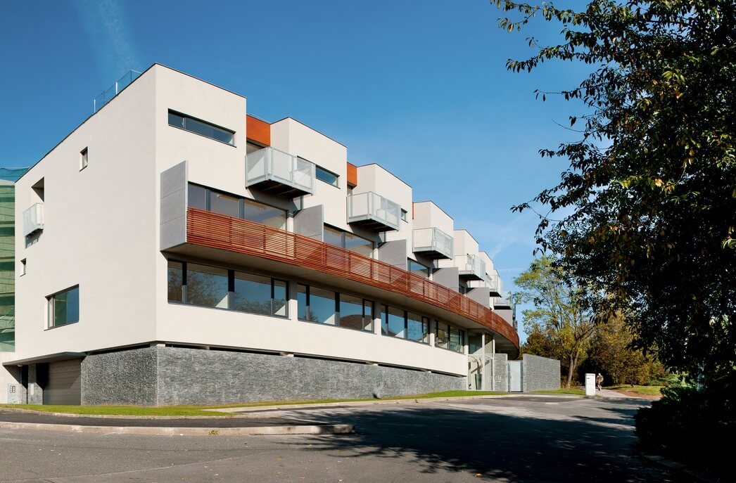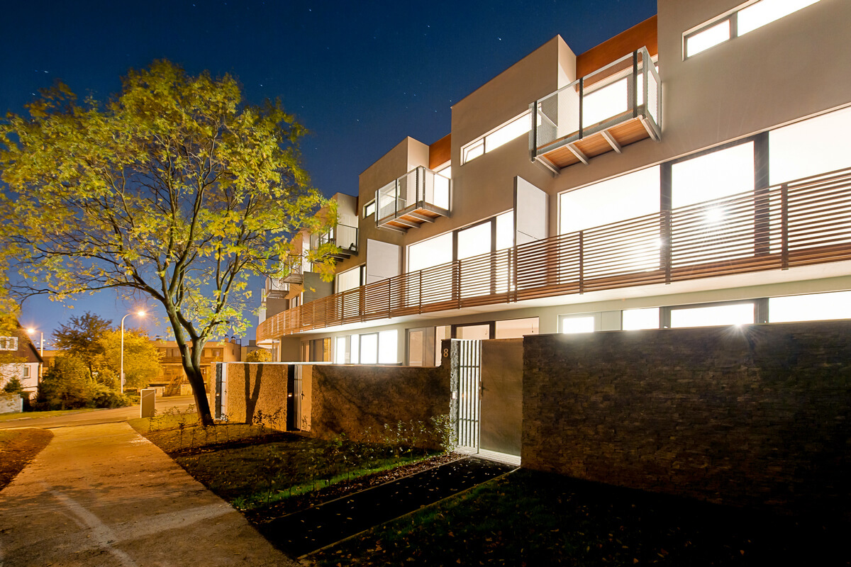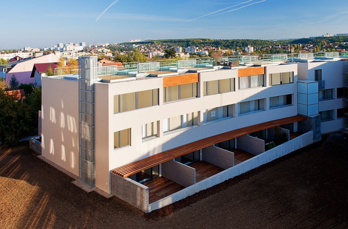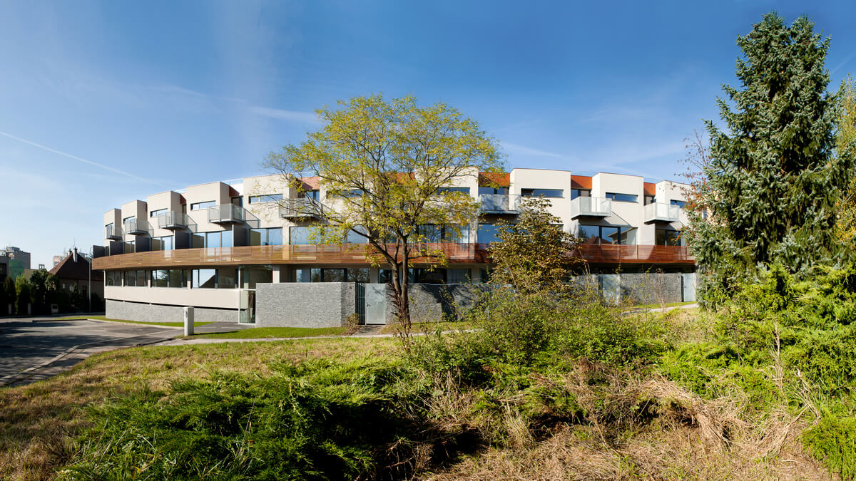 В ареале размещено 27 квартир планировок 1+кк, 2+кк, 3+кк и 4+кк с балконом или террасой, на первых этажах квартиры имеют палисадник.