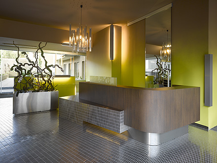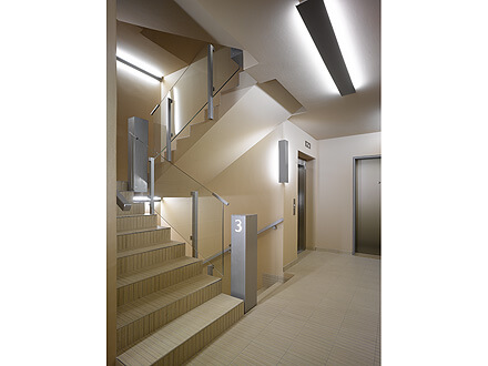 В главном здании расположена рецепция (24 часа) с охраной, а также кафе. На цокольных этажах — подземная стоянка, которая включает в себя 89 парковочных мест. Во внутреннем дворе – общественная территория с зелеными насаждениями.